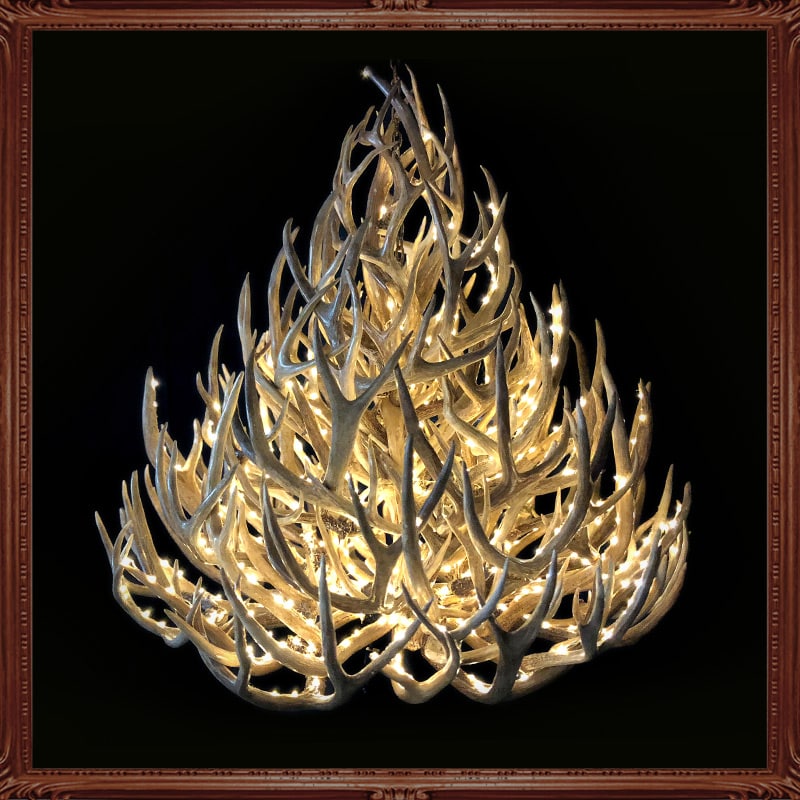 Elk antler and mule deer antler are incorporated to make a shape mainly used in rectangular spaces. The elk antler being large allows for extremely large builds. Great rooms with longer runs than widths can have an area filled easily with an oval antler fixture. Dining tables that are 6ft. or longer are great places to incorporate oval antler designs. As seen: 58L X 28w X 34h w/10 lights.